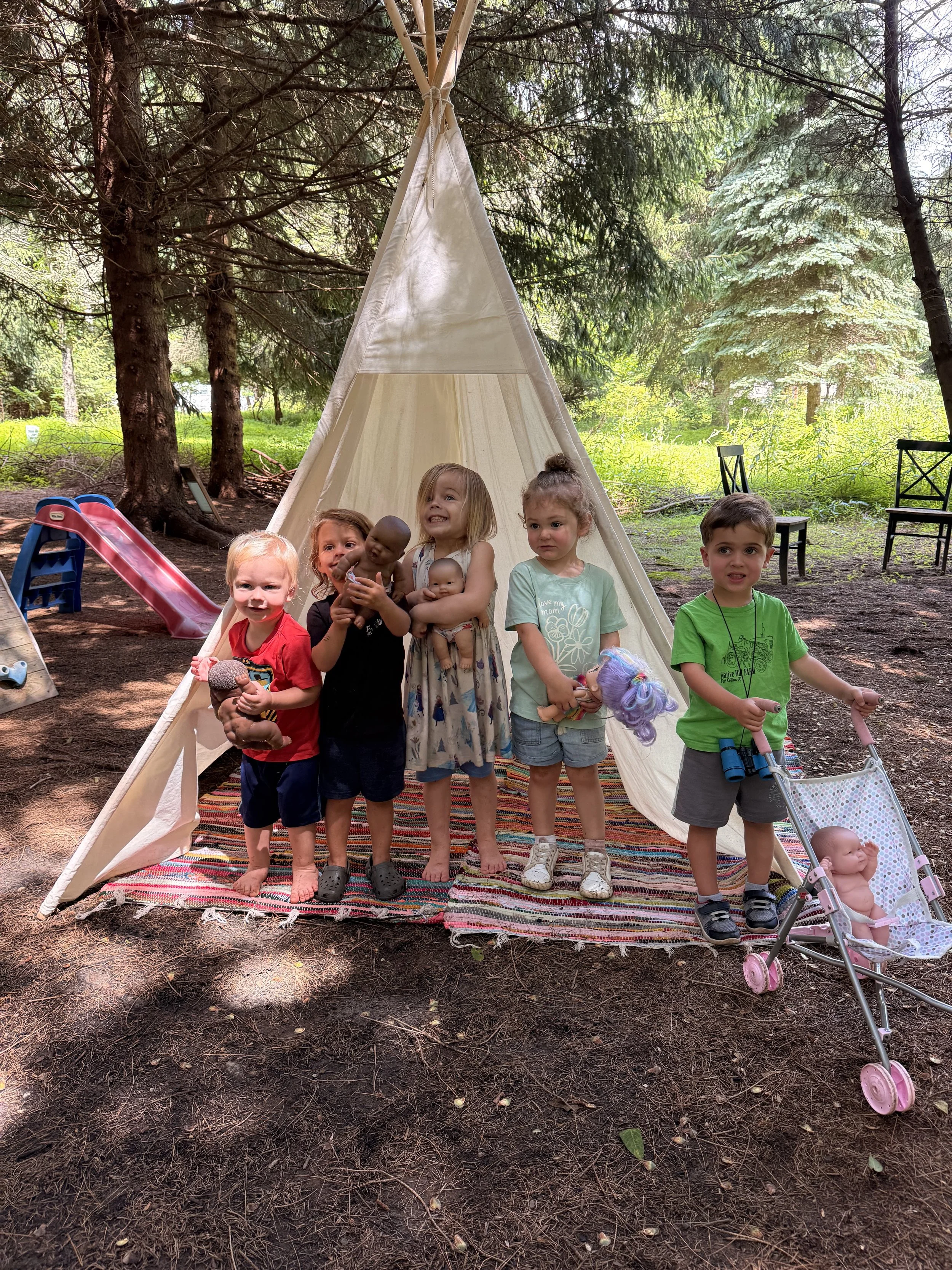 After we wiggle together, children are invited to wander freely through our natural play space—mud kitchens, nature loose parts, and more.